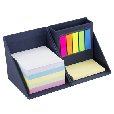 Incluye 500 hojas de notas cuadradas de colores, 50 notas adhesivas amarillas medianas, 125 banderitas adhesivas de colores y un compartimento porta-lápices.