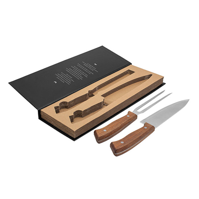 Set de Asado /(caja cerrada). Acero inoxidable 420 y Madera de Acacia. Set de 2 utensilios: Cuchillo chef de 33,5 cm y 175 g. Tenedor de 31,3 cm y 125 g., ambos con mango de madera. Presentación en caja de regalo estilo libro. 37,8 x 13 x 2,8 cm